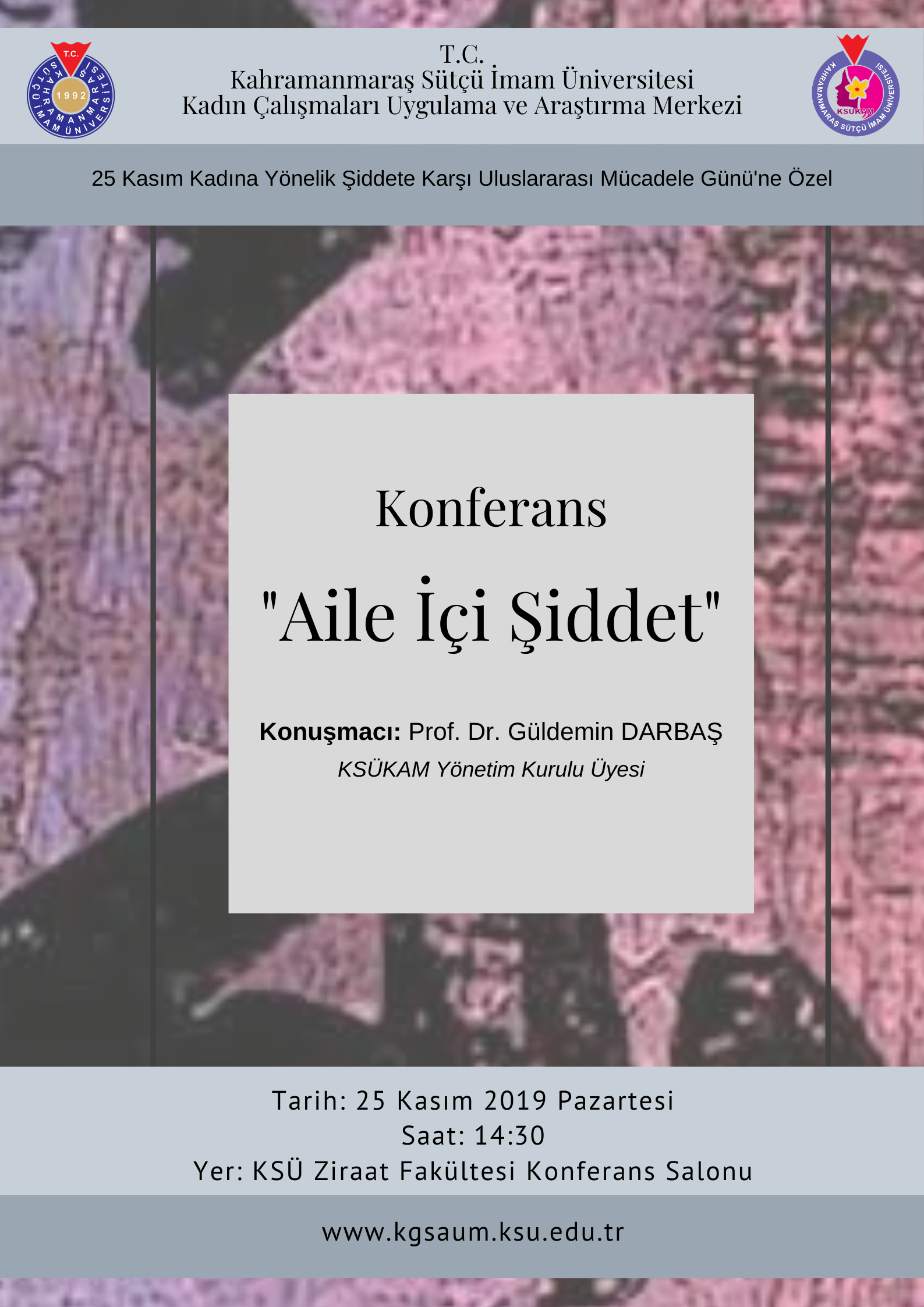 Kahramanmaraş Sütçü İmam Üniversitesi Kadın Çalışmaları Uygulama ve Araştırma Merkezi'nin (KSÜKAM) düzenlediği 25 Kasım Kadına Yönelik Şiddete Karşı Uluslararası Mücadele Günü'nde saat 14:30'da, KSÜ Ziraat Fakültesi Konferans Salonu'nda, KSÜKAM Yönetim Kurulu Üyesi Prof. Dr. Güldemin DARBAŞ'ın konuşmacı olarak olarak yer alacağı "Aile İçi Şİddet" isimli konferans etkinliğine katılımınızdan onur duyarız.