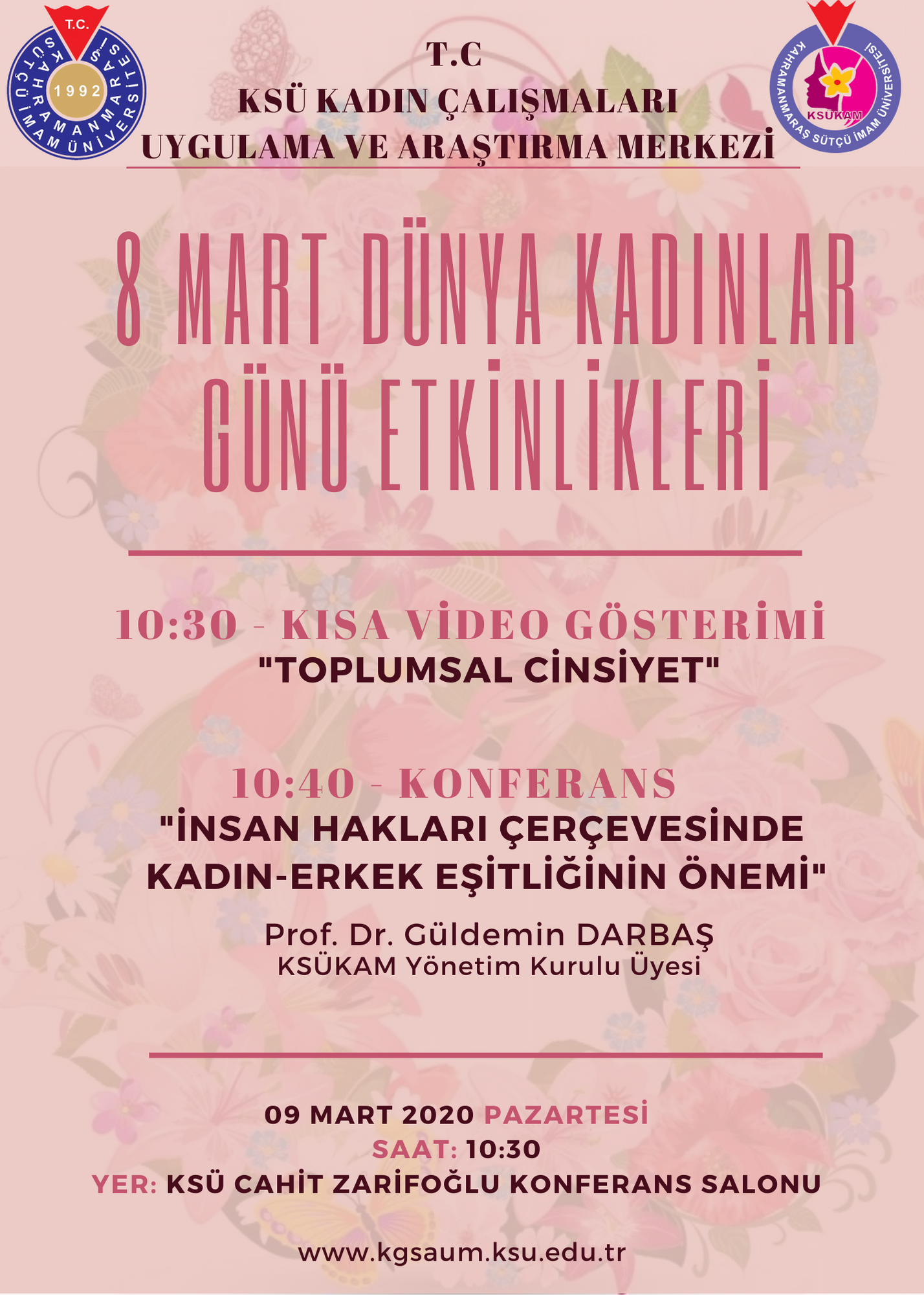 Kahramanmaraş Sütçü İmam Üniversitesi (KSÜ) Kadın Çalışmaları Uygulama ve Araştırma Merkezi (KSÜKAM)'dan 8 Mart Dünya Kadınlar Günü Etkinlikleri kapsamında "Toplumsal Cinsiyet" temalı kısa video gösterinde "8 Mart nedir? Ne değildir?" konusunu ele alacak. Ardından KSÜKAM Yönetim Kurulu Üyesi Prof. Dr. Güldemin DARBAŞ, "İnsan Hakları Çerçevesinde Kadın-Erkek Eşitliğinin Önemi" isimli sunum ile sizlerle birlikte olacak. 9 Mart 2020 Pazartesi günü saat: 10.30'da KSÜ Cahit Zarifoğlu Konferans Salonu'nda gerçekleştirlecek olan etkinliğimize katılımınızdan memnuniyet duyarız.