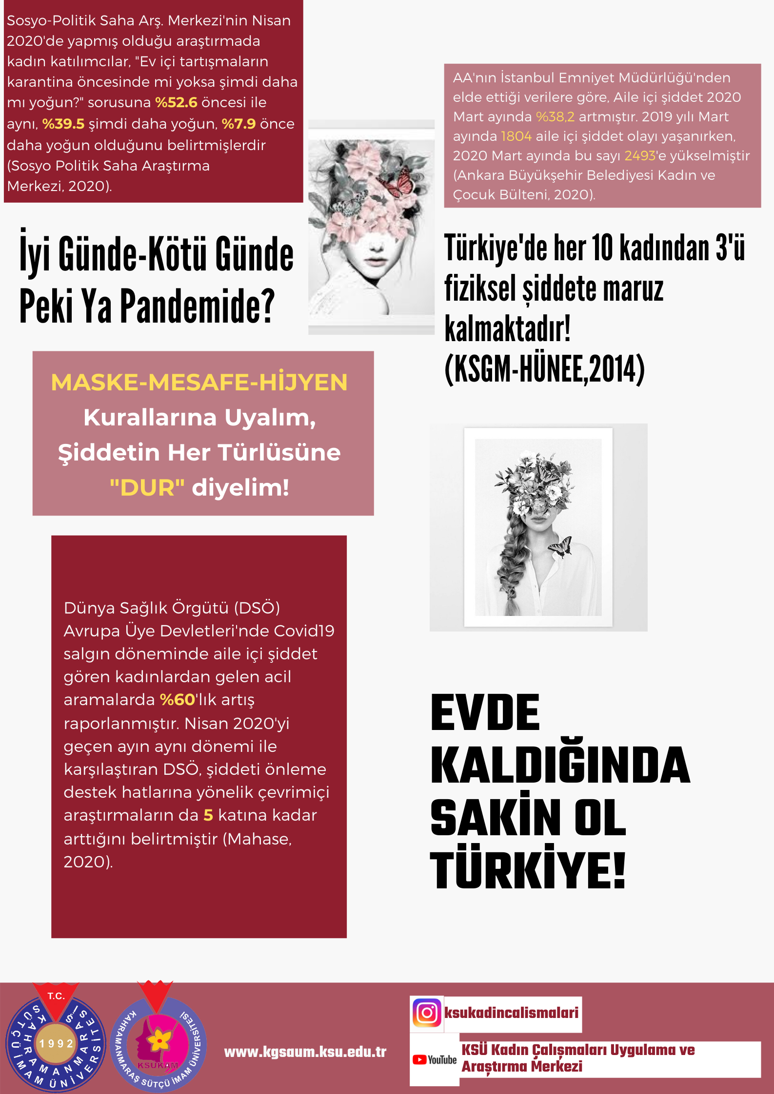 Kahramanmaraş Sütçü İmam Üniversitesi (KSÜ) Kadın Çalışmaları Uygulama ve Araştırma Merkezi (KSÜKAM) 25 Kasım Kadına Yönelik Şiddetle Mücadele Günü etkinliklerine tüm gücüyle devam ediyor. Şiddetin her türlüsüne dur demeyi ilke edinen merkez, COVİD-19 salgın döneminde şiddet öğesine dikkat çekmeyi amaçlamış, bu doğrultuda şiddete karşı bir farkındalık oluşturmaya çalışmıştır. KSÜKAM ailesi olarak "Evde kaldığında sakin ol Türkiye" diyor, kadına yönelik şiddetin karşısında duruyoruz.